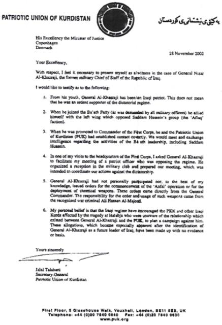 سهرهڕای ئهو نامهیهی تاڵهبانی بۆ وهزیری دادی دانمارکی، لهدانیشتنهکانی رۆژانی (ههینی 17.1.2003)و (ههینی 21.2.2003)ی دادگاییکردنی خهزرهجی لهشاری (سوغو)ی دانمارک، خهزرهجیو پارێزهرهکهی (ئهنهس یوسفسن) باسی ئهوهیانکرد کهههردوو سهرکردهی کورد مام جهلالو مهسعود بارزانی ئامادهن بۆ داکۆکی کردنو هاتن بۆ دانمارک لهپێناوی شایهتیدان بۆ بهرژهوهندی خهزرهجیو بهرپهرچدانهوهی تاوانهکانی کیمیابارانکردنی ههڵهبجهو شاڵاوهدڕندانهکانی ئهنفال کهرووبهڕووی تاوانبار خهزرهجی کرابووهوه! باشهئهگهر تاڵهبانی ههر وهکو بۆ کهناڵی (العربیة) باسی کردووهکهگوایهگوتویهتی: (ئێمهوتمان ئهو کهسه(مهبهست نزار خهزرهجی)یهکهسێکی سهربازی بووهو فهرمانی جێبهجێکردووه)، چی پێویست دهکات بێت بۆ دانمارکو شایهتی بۆ ئهو تاوانباره بدات؟ یان تاڵهبانی لهکهناڵی (العربیة)دا شتێک بهخهڵکهکهدهڵێت، کهچی لهنامهکهدا شتێکی تری نووسیوهو بۆ شایهتیدان لهناوهڕۆکی نامهکهدێت؟ دواتر مام جهلال کهخۆی بهکهسێکی مافناس ناودهبات، ئایا کهسێکی مافناس دهکرێت پاساو بۆ تاوانباران بهێنێتهوهبهوهی کهگوایهفهرمانی (سهددام)یان جێبهجێکردووهو تاوانهکههی (سهددام)هو، جێبهجێکهرانی تاوانهکهلهشێوهی نزار خهزرهجی، وهفیق سامهڕائیو سوڵتان هاشم نابێت سزا بدرێن؟ ئایا کهسێکی مافناس دهبێت بێئاگا بێت لهوهی کهبهگوێرهی یاساکانی دادگای دادپهروهری نێودهوڵهتی سهر بهنهتهوهیهکگرتووهکان، ههرکهسێک کهفهرمان جێبهجێبکاتو تاوان ئهنجام بدات، ئهوهجێبهجێکردنی فهرمان نابێتهپاساو بۆ بێتاوانی ئهنجامدهری تاوانهکه؟ نموونهش دادگاییکردنی ئهفسهرانی نازی ئهلمانی (دادگای نۆرمبێرگ) لهدوای شهڕی جیهانی دووهمو ئهفسهرانو بهرپرسانی یۆگۆسلاڤیاو کهمبۆدیایهکهتاوانهکان بهتهنیا نهبوونههی ئهدۆڵف هیتلهر (20.4.1889-30.4.1945)، سلۆبۆدان میلۆسۆڤیچ(1941-18.3.2006)و پۆل پۆت (19.5.1928-15.4.1998)!