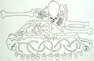 لە دوو تابلۆدا بە ئێسک و پروسکی مرۆڤ وێنەی دەمانجە تانکی کێشاوە و
